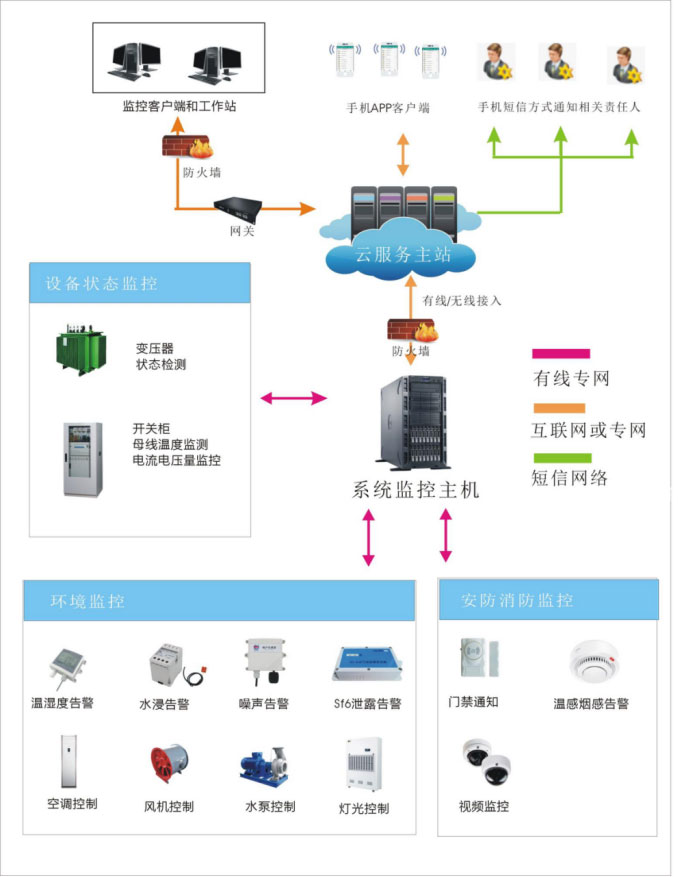 GZ2000 智能配电房监控系统是智能化(配电房)在线监测系统,可接入电流、电压、开关位置、储能状态、漏电保护器动作状态、门禁系统、温度湿度、水浸、浓烟、明火、电缆接头温度和变压器温度、SF6检测等各种传感器以及照明、排风、除湿机、空调等设备。调度中心可显示各台区即时图像及数据,并绘成各参数曲线图,使工作人员可以远程控制检测各台区运行状况并实现远程控制,如出现故障或险情,会马上推送告警信息、及时提醒有关人员。支持电脑客户端、微信公众号、手机APP和电话、短信、等信息推送。