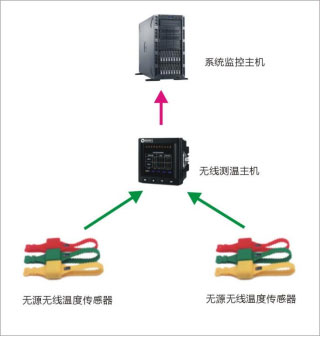 开关柜无线测温模块由无源无线传感器、无线接收主机组成,接收主机通过RS485连接到一体化监控装置。